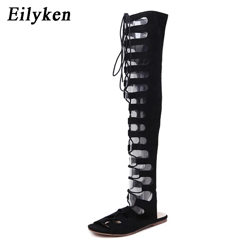 Kopen Goedkoop Eilyken Gladiator Lace Up Vrouwen Laarzen 2018 Open Teen Knie Hoge Zomer Cross gebonden Leisure Platte Motorlaarzen Sandalen Prijs