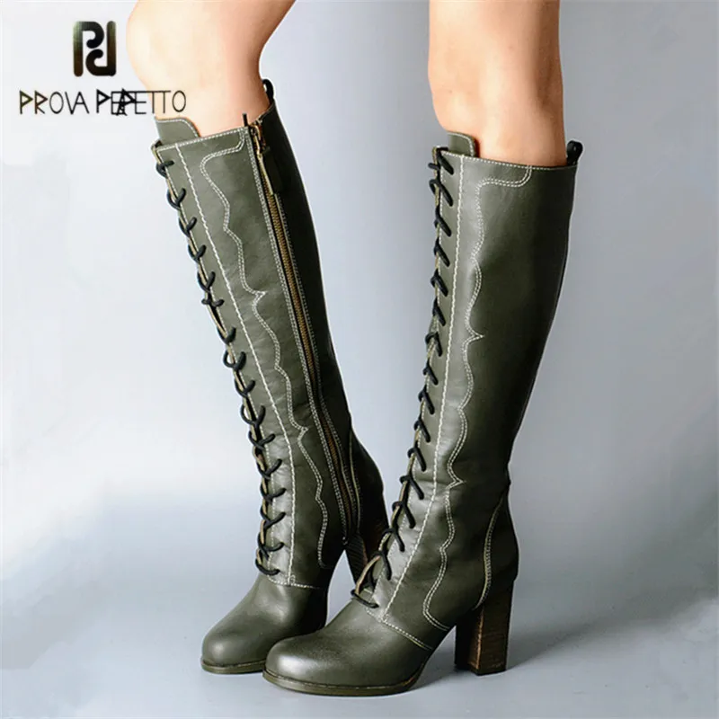 Goede Koop Prova Perfetto Groene Retro Vrouwen Knie Hoge Laarzen Vrouwelijke Lederen Hoge Laarzen Lace Up Platform Hoge Hak Rubber Botas Goedkoop