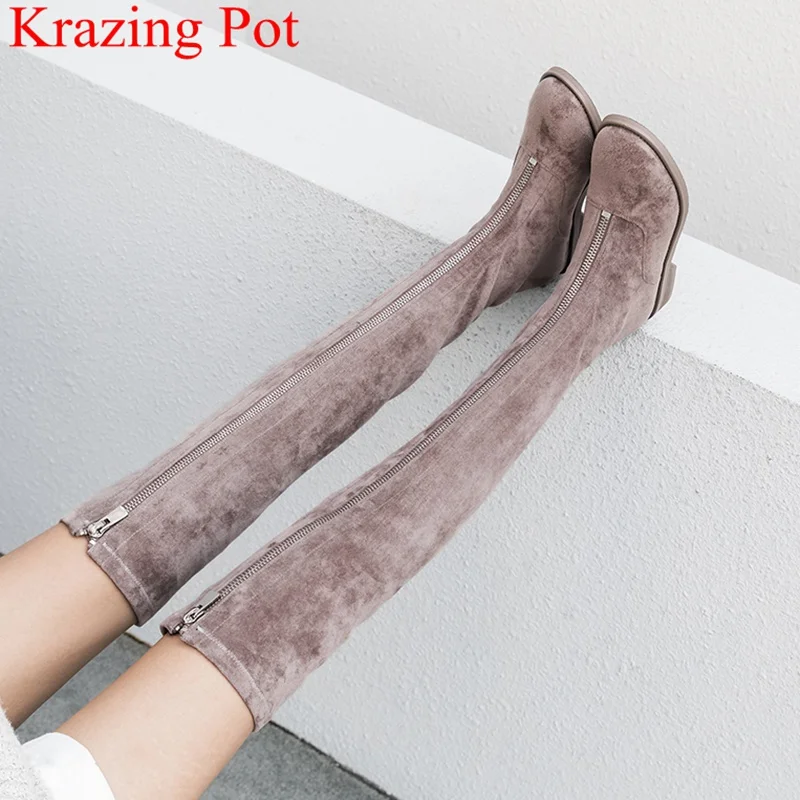 Kopen Goedkoop 2018 superstar ronde flock beknopte elegante rits dikke hak vrouwen over de knie laarzen runway office dame dij hoge laarzen l3f1 Prijs