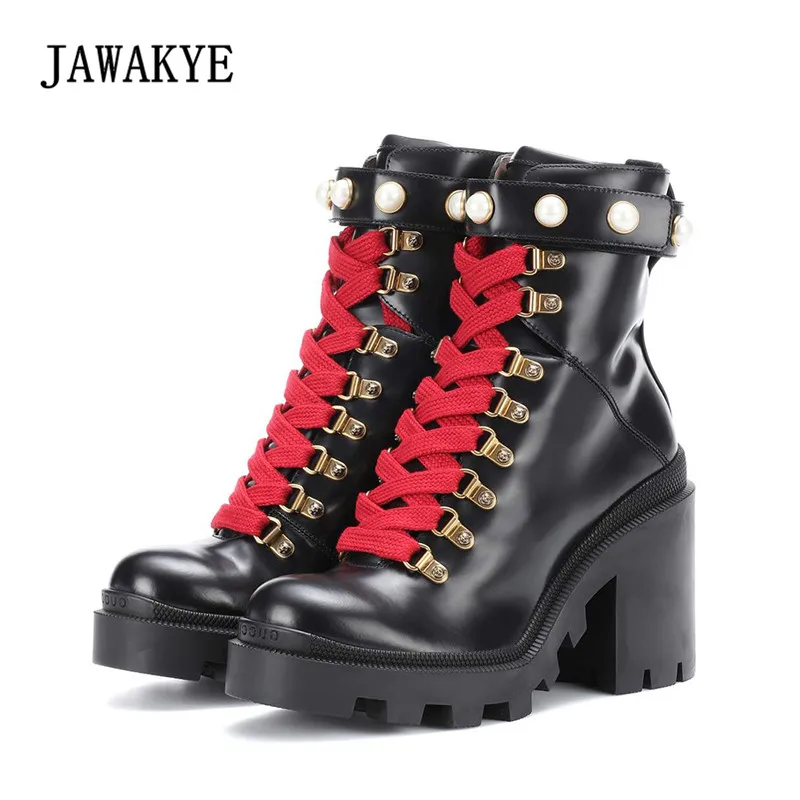Beste Koop 2018 Nieuwste Enkellaars Voor Vrouwen Ronde Neus Parel Metalen Klinknagel Lace up Platform Laarzen Vrouw Mode Koele Motorfiets laarzen Goedkoop